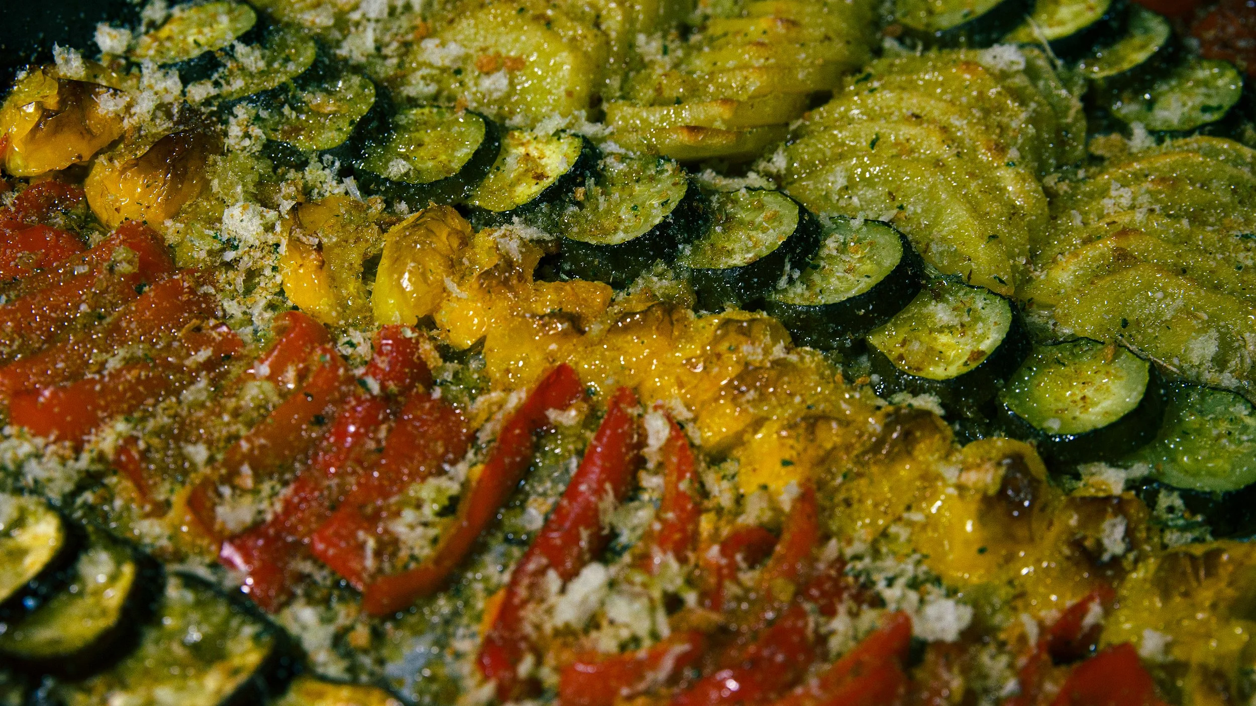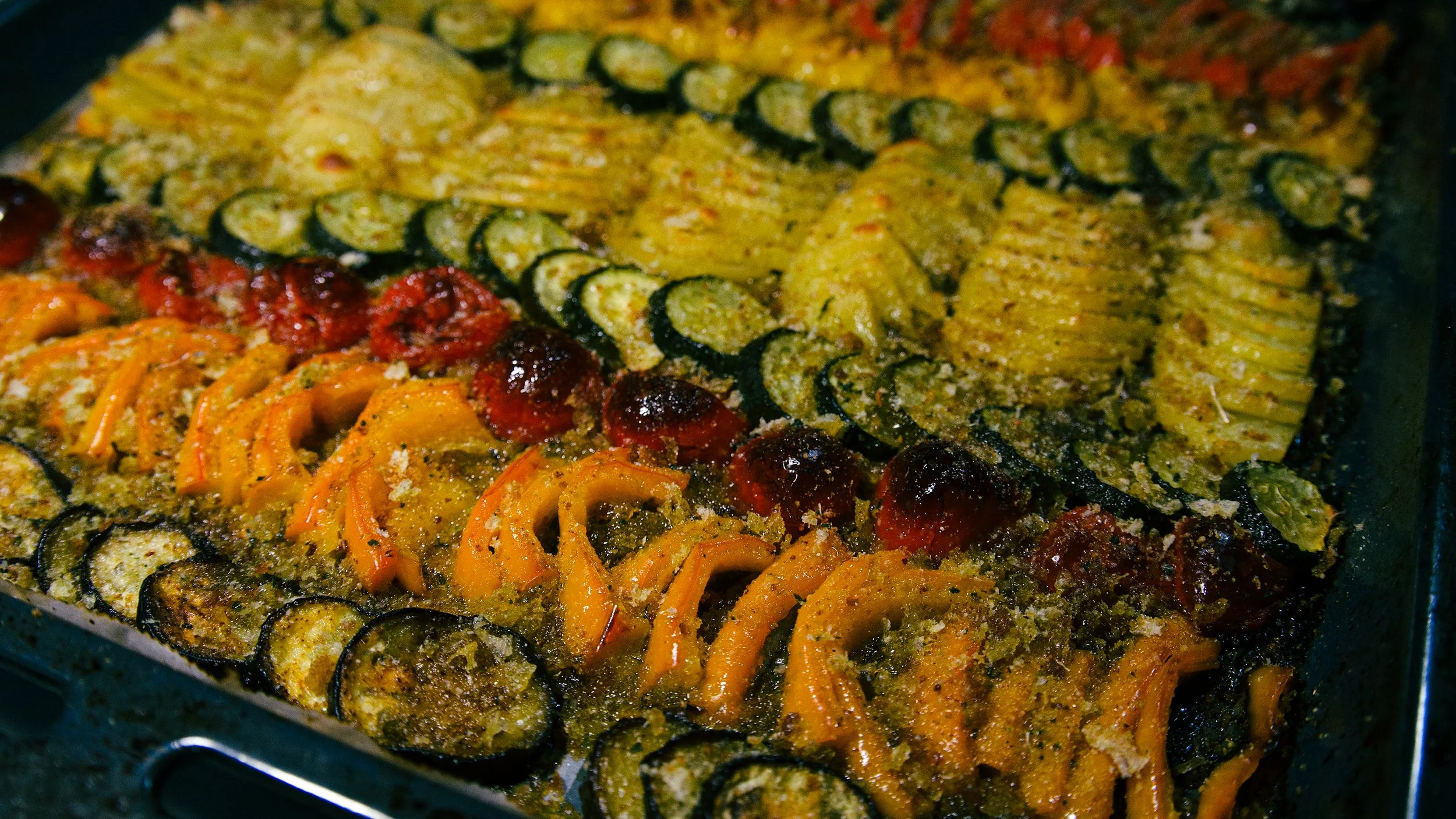Togliere dal forno e servire sistemando, secondo i colori, i vari ingredienti in un piatto da portata.
