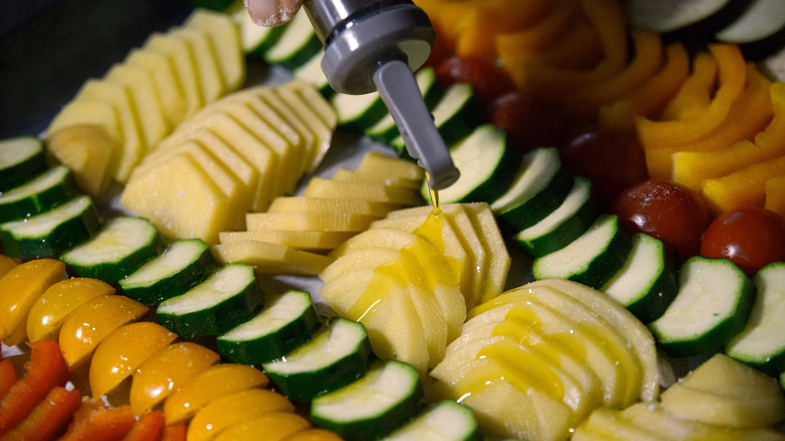 Posizionare tutti gli ingredienti sulla leccarda secondo uno schema che permette di far risaltare i colori.