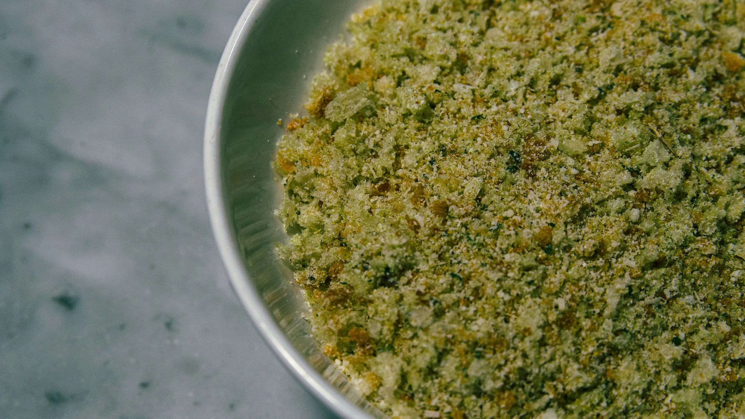 Estrarre dal forno la leccarda, controllare la cottura, cospargere il tutto con la panure, irrorare con altro olio extra vergine e infornare nuovamente per altri 5 minuti in modo che si forni una leggera doratura della panatura.